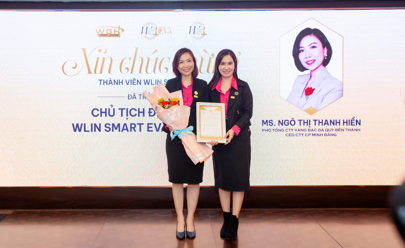 TS. Ngô Thị Mai - Chủ tịch sáng lập WLIN Smart Eva đại diện tặng hoa chúc mừng Ms. NGÔ THỊ THANH HIỀN - Phó Tổng Giám đốc công ty cổ phần Vàng bạc đá quý Bến Thành trở thành tân chủ tịch điều hành Wlin Smart Eva.